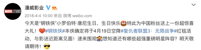 2018年4月19日,中国,《复联3》上映前夕,暨主演小唐尼生日&漫威十年盛典,片方借机在上海迪士尼办了一场见面会。