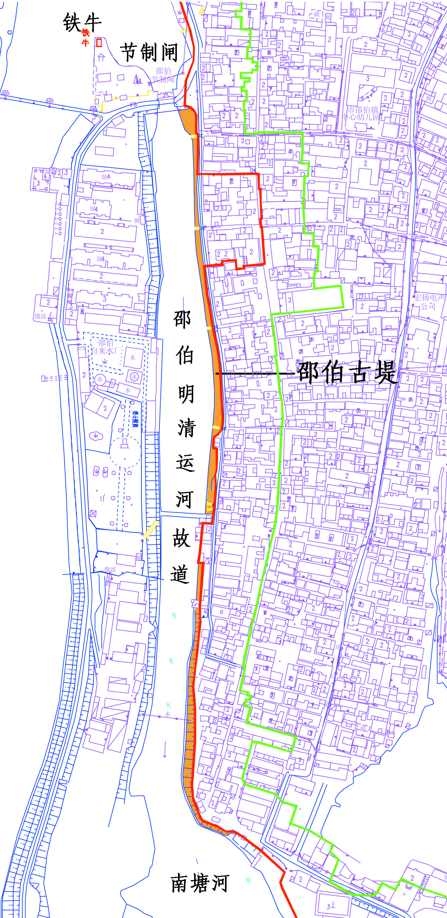 (3)水工设施:包含于所处河道的遗产区内,不单独界划,必要时局部外扩河道界线以包含整个设施及其下部基础。
