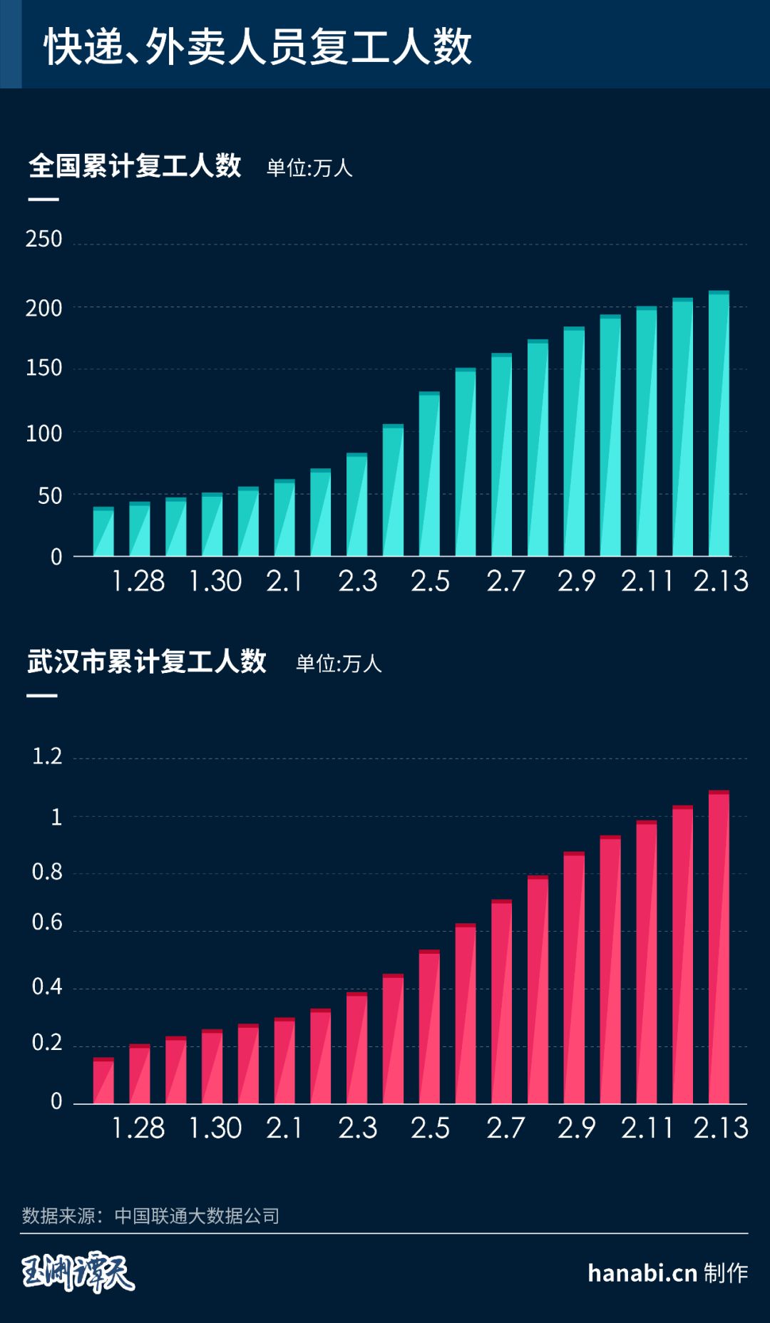 这意味着,10号之前,许多快递和外卖小哥已经先行一步,返回岗位。截至2月13日,全国外卖和快递人员复工人数达213万人,复工比例62.33%。