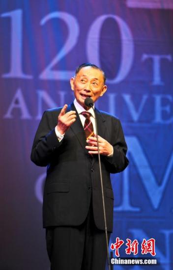 2014年,纪念梅兰芳诞辰120周年“双甲之约”巡演登陆济南,京剧梅派艺术掌门人、梅兰芳之子梅葆玖、京剧表演艺术家刘长瑜等京剧名角登台献唱。图为梅葆玖演唱父亲经典唱段《贵妃醉酒》。 中新社记者 张勇 摄