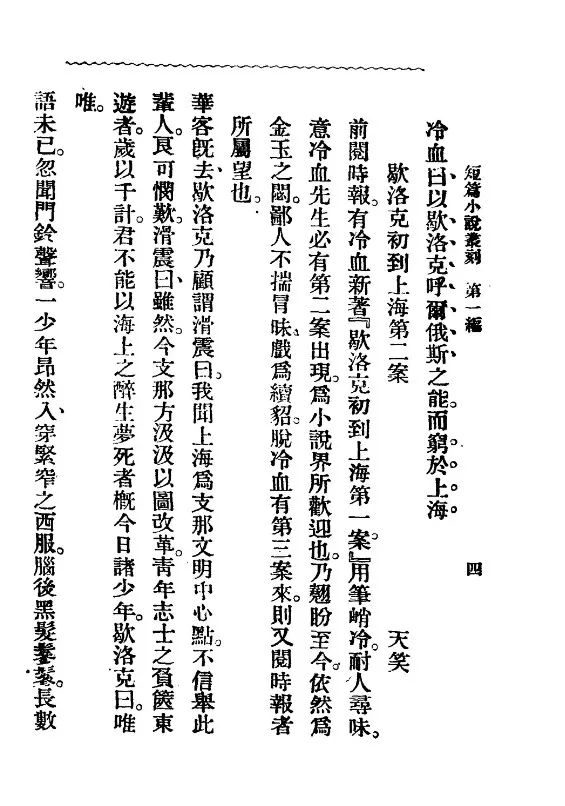 同时,他们又认为西方小说“率皆为读者身心智慧之益,穷究物理,洞达世情,又复激昂奋发,刚健不阿”,正是吾国国民所需要的。在这种时代浪潮之下,我国开始兴起了一股引进翻译西方小说的热潮,侦探小说也混杂其中,被引进了中国。