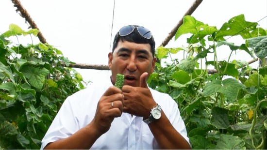 中国农民在俄罗斯阿斯特拉罕州种植的农产品深受当地民众欢迎。图为当地政府官员为中国黄瓜点赞。 林雪丹 摄