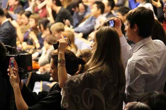 莫斯科国际关系学院,习大大演讲现场。见习大大走上讲台,同学们纷纷站起来拿出手机拍照。 林雪丹 摄