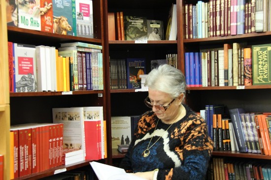 俄罗斯国立人文大学书店中国作品专区,一读者正在翻阅俄文版莫言小说。 林雪丹 摄