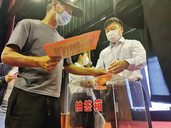 下午1点,首先对申请公租房的61户家庭进行配租。考虑到个别特殊困难群体的身体需求,2户家庭事先申请参与摇号一楼房源。在工作人员指引下,2户家庭代表上台,分别抽中幸福园和佳家如意园一楼房源。