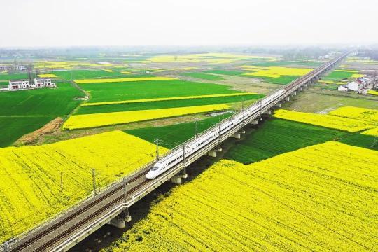 一列高铁穿过天门市麻阳镇的油菜花海和麦田。(湖北日报全媒记者 陈勇 摄)
