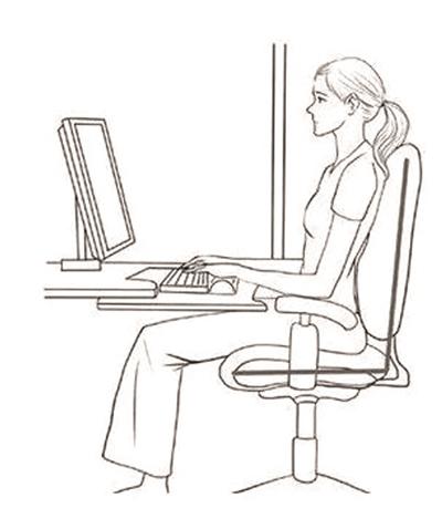 脊柱由24块椎骨、一块骶骨及尾骨组成,每个椎骨之间还有椎间盘做缓冲保护的工作。脊柱形成四个自然生理弯曲,分为颈前曲、胸后曲、腰前曲、骶后曲,四个部位连起来形成完美的弧线,才使脊柱如弹簧般有力、坚韧而稳定。健康的坐姿应该是保持脊椎直立不驼背。长期在电脑前工作的人,适当抬高电脑显示器,尽量不长期“伏案”工作。上身挺直,胸离开书桌10厘米,使胸背肌张力均衡,两腿平行自然放下,脚掌自然放置。