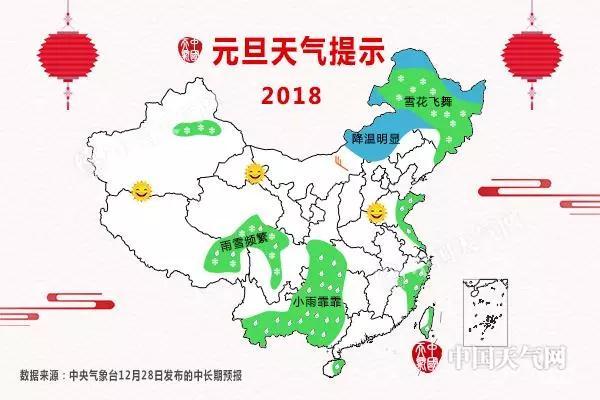 央视网消息:关注元旦假期的天气情况。根据中国气象局昨天的消息,2018年元旦假期(12月30日至1月1日),全国大部地区以晴天为主,适宜出行;东北和西南部分地区会有雨雪天气,中东部受冷空气影响可能会出现大风、降温。