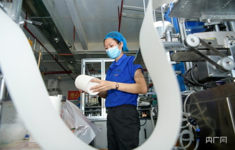 近日,位于海口高新区的一塑料包装有限公司生产车间,8条生产线运转不停,一个个全生物降解纸杯、纸碗、纸碗盖源源不断地从机器里弹出,工作人员迅速对其进行分批、测试、打包。