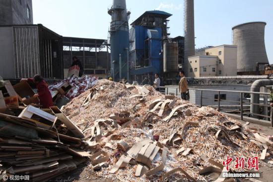 资料图:2017年03月14日,河南许昌,工作人员将假冒伪劣香烟倾倒在焚烧炉旁。图片来源:视觉中国