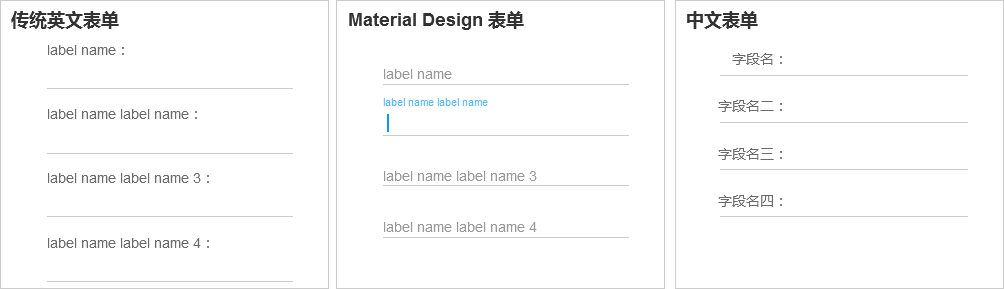 同样的区域,英文表单占用的空间更大,页面也显得更松散,而中文的表单就显得更拥挤。如果中文表单间距过大,反而很奇怪,而且影响效率。Material Design表单比传统的英文表单更紧凑一些,目前已经很多英文表单采用。但是仍然不如中文表单效率高。