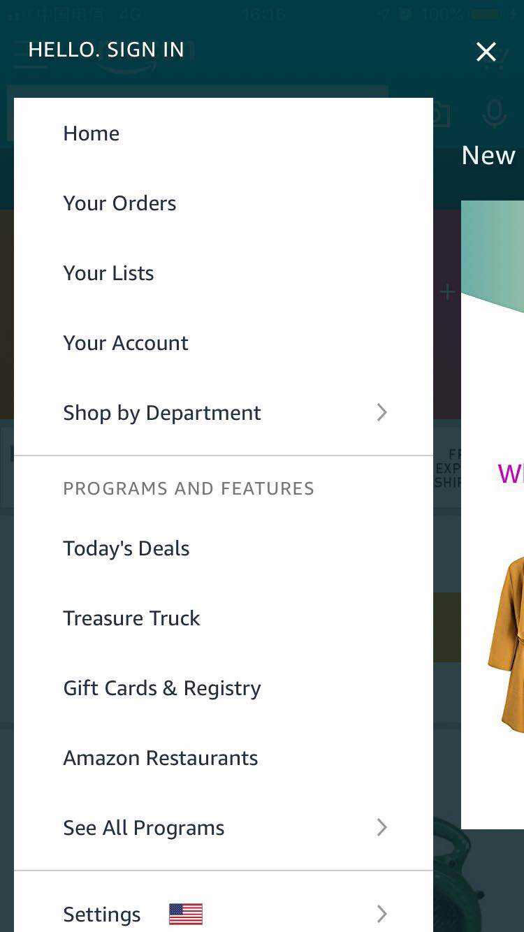 第二个例子这是Amazon的侧边导航栏。这种侧边导航的方式由Path最早采用,曾经在国内也是红极一时,但是后来被各种数据验证为是一种不好的交互方式后,国内APP已经纷纷不在使用这种交互。但是国外APP很多仍然保留这种方式的,原因仍然在于语言文字。
