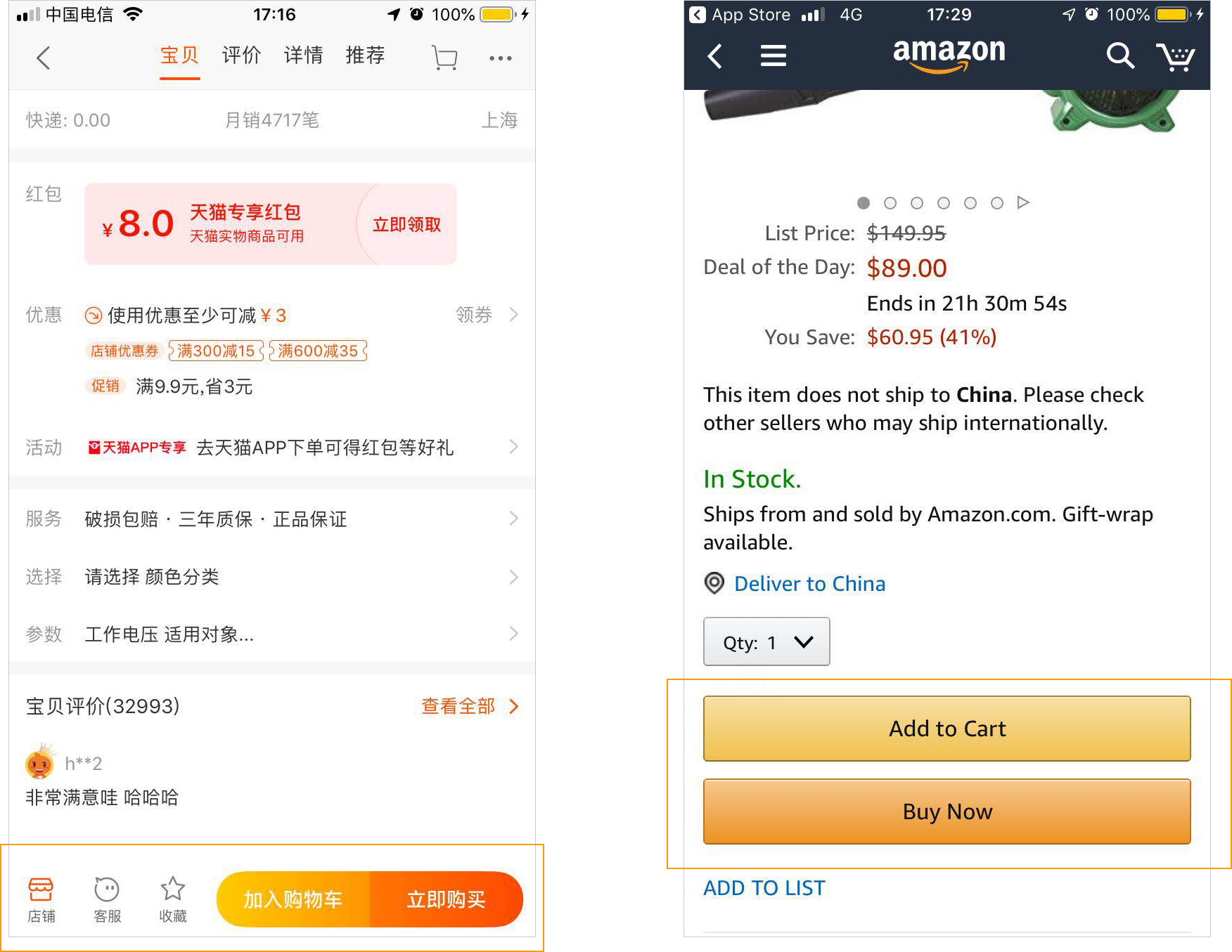 虽然图中的例子似乎“Add to Cart”也能放在底部排得下,但是英文的长短太不稳定了,如果是一个“Add to Favorites”可能就放不下了。所以常见的英文APP会比较少采用底部固定悬停多个操作这种交互方式。