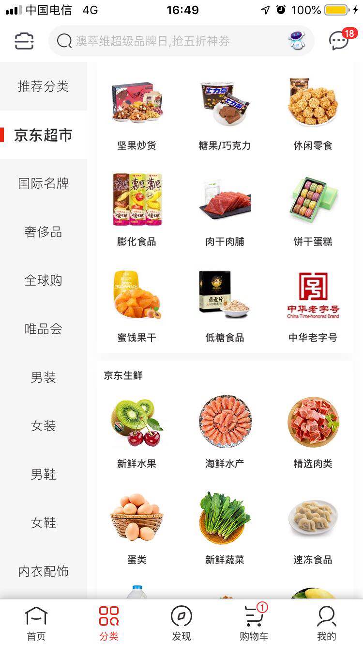 再比如:下图中,京东的这种方式,也是英文APP无法采用的。左边大分类、右边小分类的分屏布局在英文手机APP上都是很少见的,因为这种样式对于英文来说无法排版。而上面图片、下面名称的这种样式,在英文APP上也是使用得比较克制。比如说:中文的“干果坚果”,而英文则一行显示不下“Dried Fruits & nuts”,影响视觉效果。