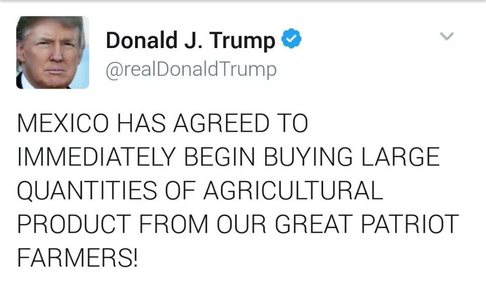 据特朗普在自己的推特上骄傲宣称,“墨西哥已经同意立即从我们伟大的爱国农民那里购买大量的农产品”。