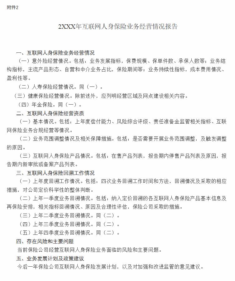 (十七)保险公司开展互联网人身保险业务,应于每年3月20日前通过互联网保险监管相关信息系统提交上年度经营情况报告(模板详见附件2,报告数据应截至上年度12月31日),完成互联网人身保险业务经营及信息披露登记。