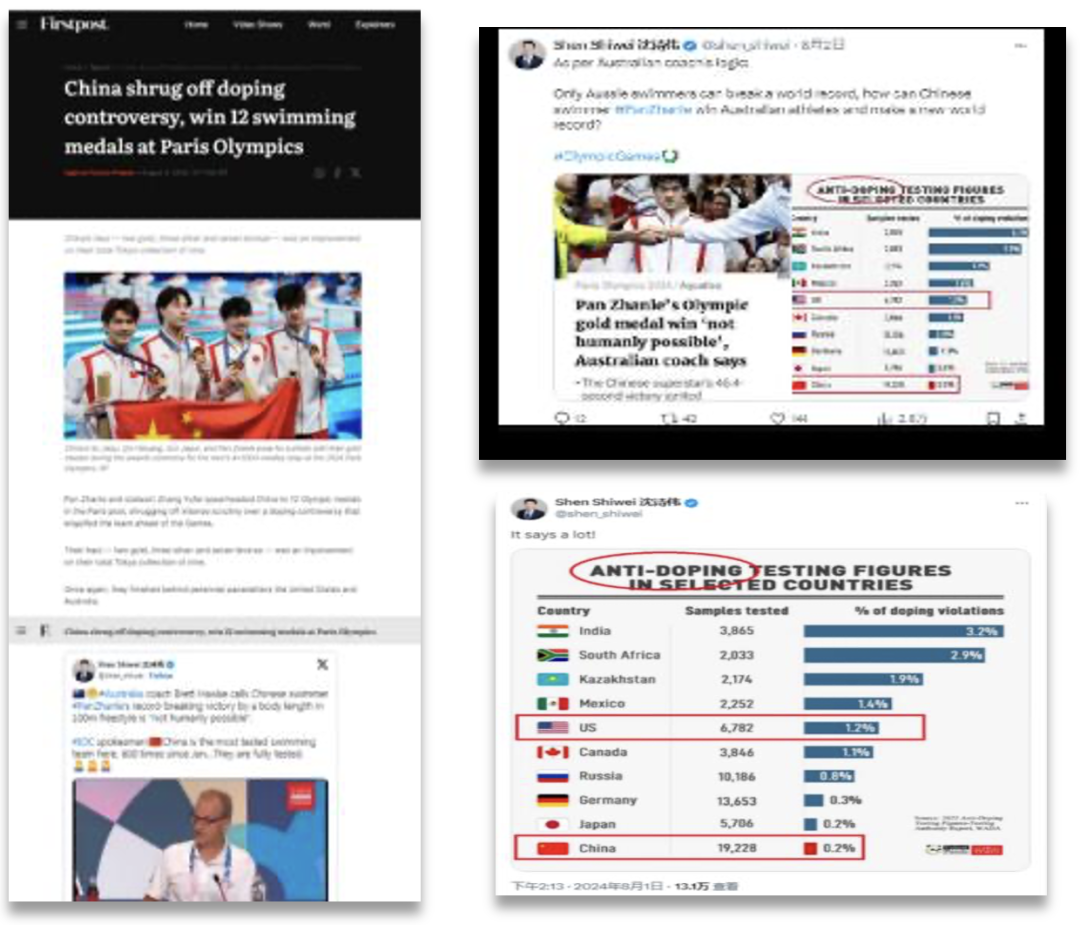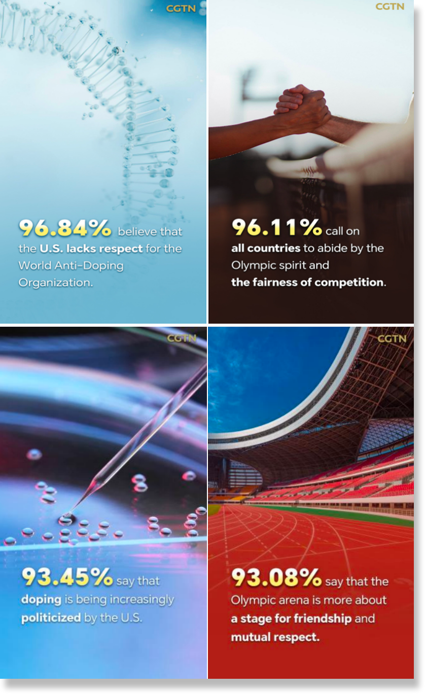 各类融媒体产品也以丰富的形式切入这一话题,直戳美西方痛点,坚决捍卫奥林匹克精神。CGTN《漫话天下》专栏推出系列漫画产品,呼吁美国应该反省其体育界的兴奋剂问题,而非别有用心地针对中国运动员。《茶馆论道》(T-House)用数据说话,发布原创数据图文《中国游泳队接受高频检测 美国无视结果继续抹黑中国》《美国运动员兴奋剂违规率比中国高6倍,谁才是“作弊重灾区”?》,引用世界反兴奋剂机构的权威报告,客观比对违规数据,揭露美国“借题发挥”的虚伪面目。玉渊谭天制作原创视频,模拟一名普通美国运动员在美国兴奋剂全产业链庇护下,取得“用药豁免权”的案例,揭示美国这一全产业链如何帮助运动员作弊。