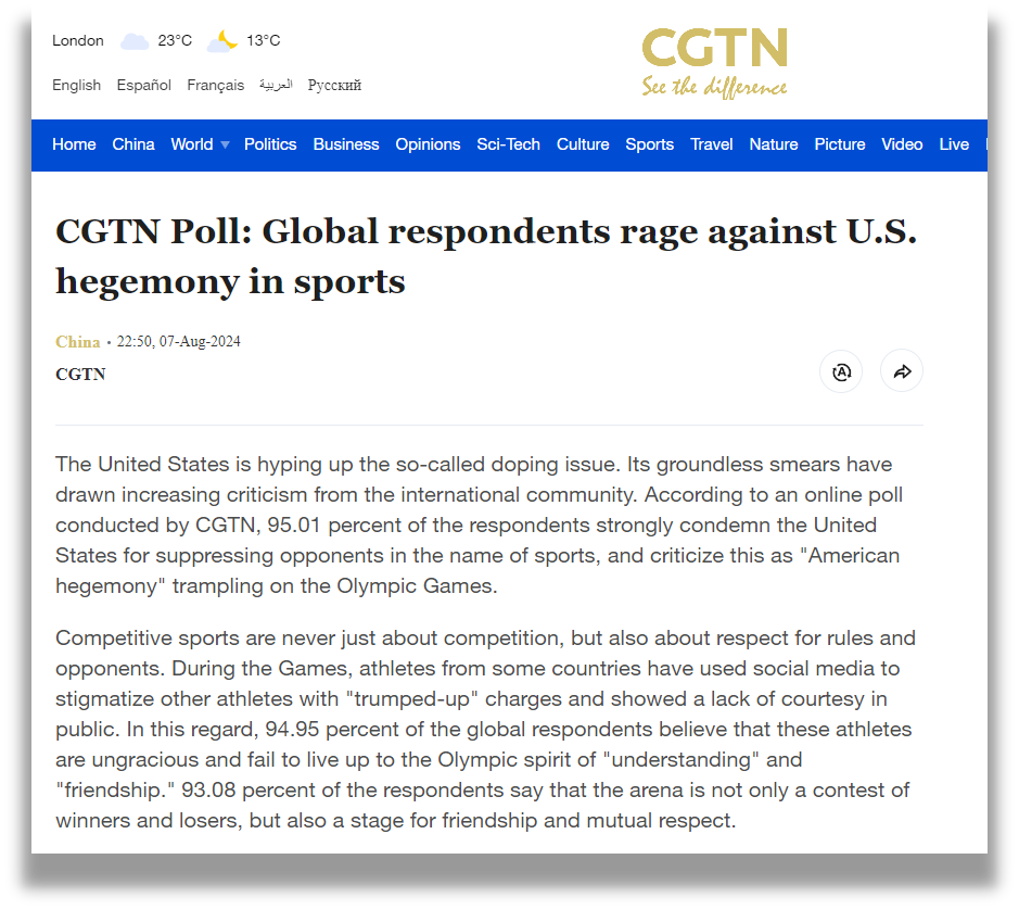 总台CGTN先后两次发起全球民调,调查显示,96.84%的受访者认为美方缺乏对世界反兴奋剂机构的尊重,是在挑战公平和权威;96.25%的受访者痛批美国在兴奋剂监管方面“双重标准”;93.45%的受访者表示,兴奋剂问题日益被美国政治化和工具化;95.57%的受访者认为美国反兴奋剂机构或存包庇行为,为涉兴奋剂的美国运动员开脱……