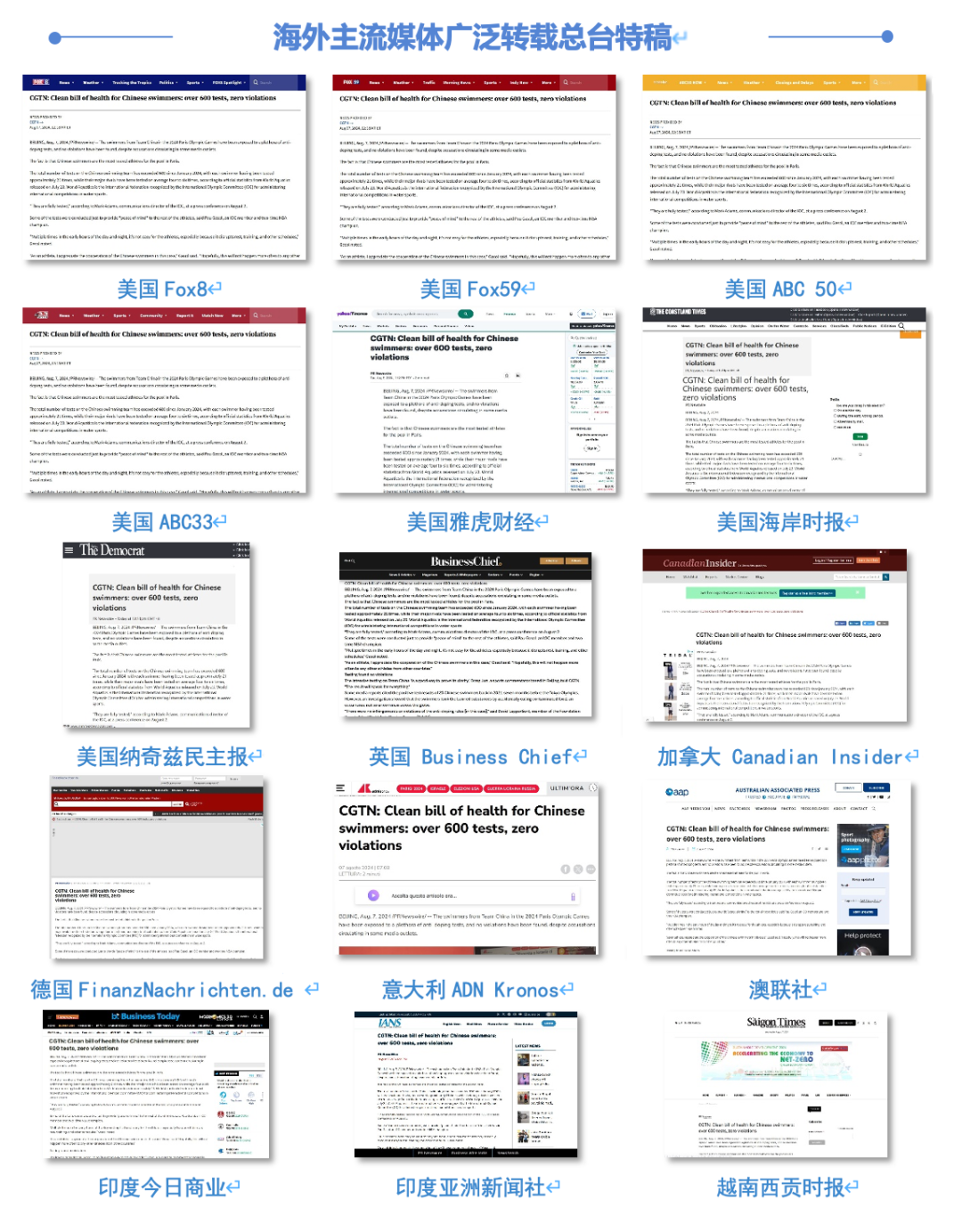 还有总台多语种评论各展所长,《对中国游泳队员频繁的兴奋剂检测合理吗?》《美国的抹黑无法破坏奥运团结》《实力是对偏见和质疑的有力回击》等图文、视频评论产品集中发出,在国际舆论场上形成强大声势。