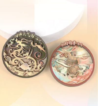 以河南博物院收藏文物“四神云气图”和“妇好鸮尊”为原型设计的木质冰箱贴。