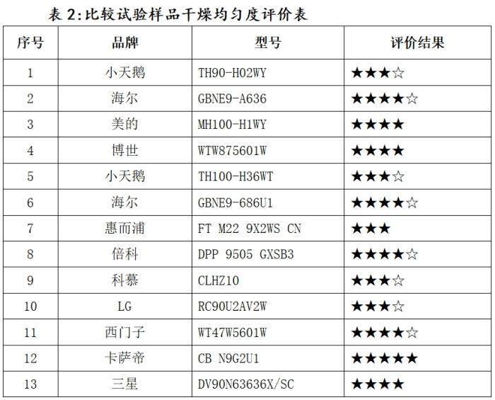 试验结果还显示,13款样品在干燥均匀度方面存在一定的差别,其中有5款干燥均匀度表现优秀,评价为五星或四星半级,惠而浦型号为FT M22 9X2WS CN的干衣机样品再被评为三星级。