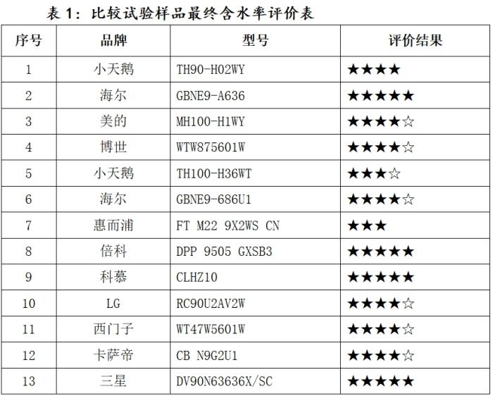 近日,中国消费者协会、河北省消保委、重庆市消保委联合发布的13款热泵式滚筒干衣机比较试验报告显示,有10款样品的最终含水率低于2%,干燥效果良好。仅惠而浦型号为FT M22 9X2WS CN的干衣机样品评价是三颗星。