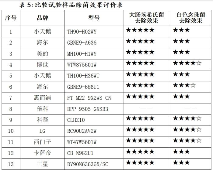 在对白色念珠菌的去除效果上,小天鹅TH90-H02WY型号、海尔GBNE9-A636型号、美的MH100-H1WY型号、小天鹅TH100-H36WT型号、惠而浦FT M22 9X2WS CN型号、卡萨帝CB N9G2U1型号、三星DV90N63636X/SC型号等干衣机样品被评为三星级。